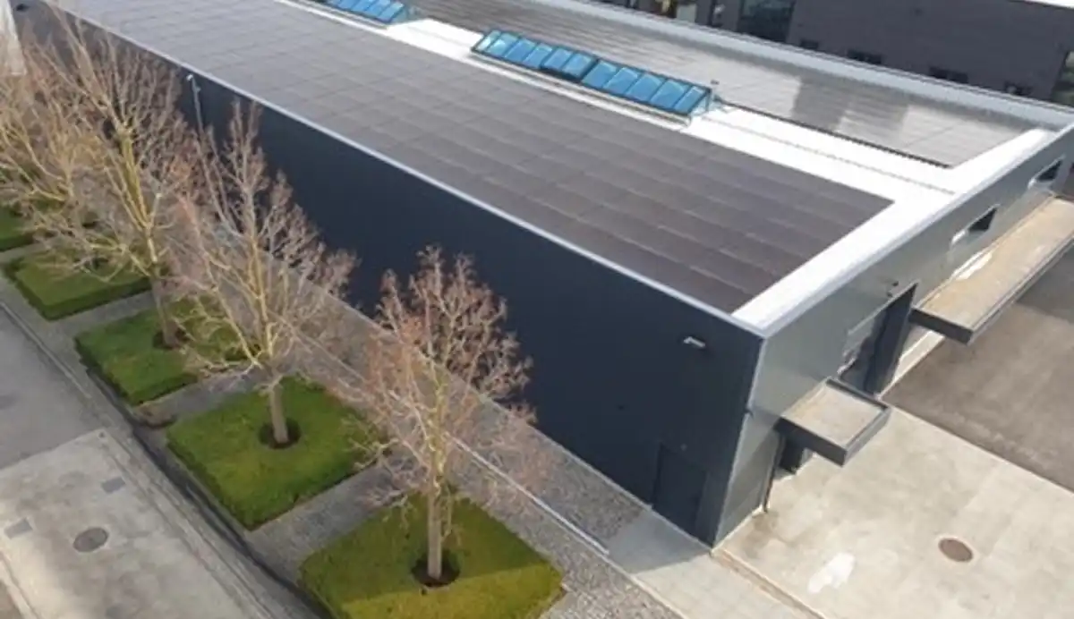 Die Flachdächer sind mit Solarpanels zur eigenen Stromproduktion bebaut und ermöglichen eine ressourcenschonende Energieversorgung direkt vor Ort. Seit der Inbetriebnahme im Jahr 2023 werden jährlich rund 250.000 kWh erzeugt, wovon bis zu 70.000 kWh als überschüssige Energie ins öffentliche Netz eingespeist werden.